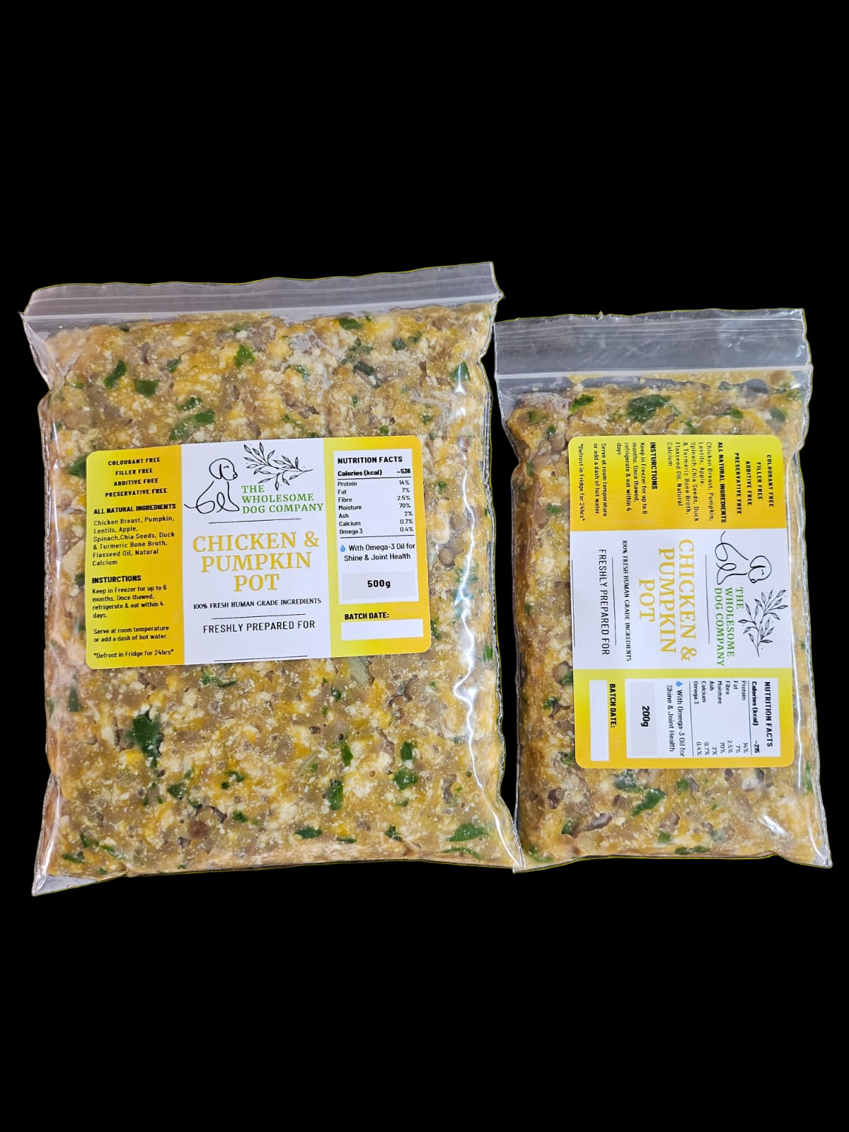 HUMAN GRADE ALL NATURAL INGREDIENTS: CHICKEN BREAST, FRESH PUMPKIN, BROWN LENTILS, APPLE, SPINACH, CHIA SEEDS, FLAXSEED OIL, DUCK & TURMERIC BONE BROTH, NATURAL CALCIUM
