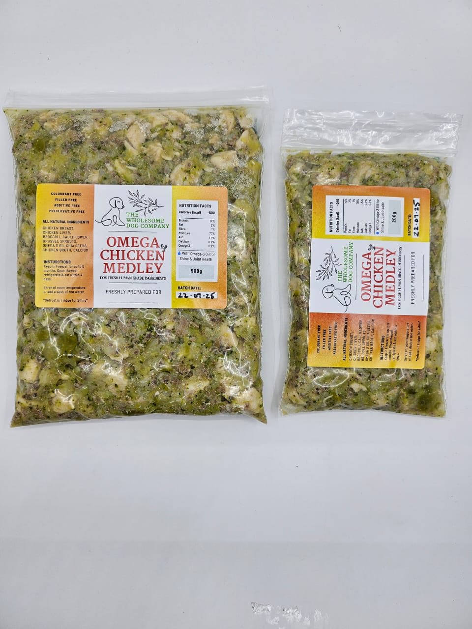 Succulent chicken breast and nutrient-rich liver gently poached in savoury chicken broth, paired with a trio of garden greens — broccoli, cauliflower, and brussels sprouts — finished with Omega 3 oil, chia seeds, and natural calcium. Crafted to support immune function, skin health, and strong bones with every bite.